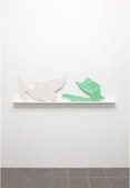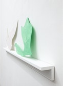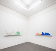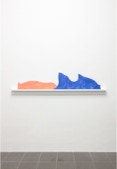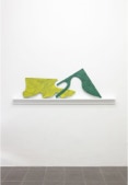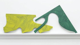 Volker Saul hat vor Jahren für ein Projekt aus 2 mal 3 Meter großen Aluminiumplatten organoide Formen herausschneiden lassen. Nun ist Saul auf die verbliebenen Reststücke gestoßen, sind sie doch in ihrer drei Millimeter Dicke à la shaped canvases sozusagen von vergleichbarer Qualität. Die Form ist nicht eindeutig zu definieren und fern aller Symbolik. Manche der 26 »Negativa« haben neben ihren weich fließenden Begrenzungen die harten Kanten der originalen Platten. Saul hat den grundierten Teilen spontan mit großzügiger, schwungvoller Geste Farbe aufgebracht, vielfach noch eine weitere andersfarbige Acrylschicht, ohne die untere gänzlich zu überdecken. Die abschließende Lackschicht lässt die lebendige Oberfläche mitsamt der dicken, wenig formgerechten Pinsel- und Farbspuren wirksam werden.