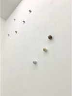 Productivity, Challenge, Titanium, Pro Power, Pro Staff, Top Flite, Black Diamond, …”, 2023, 20 found golfing balls in constellation on wall,